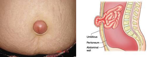 Στους ενήλικες η ομφαλοκήλη αποτελεί επίκτητη διάνοιξη , βίαια του ομφαλικού δακτυλίου με αποτέλεσμα την έξοδο δια του ομφαλικού δακτυλίου άλλοτε λεπτού ή παχέος εντέρου ή όπως είναι και το πιο συχνό , επίπλουν.